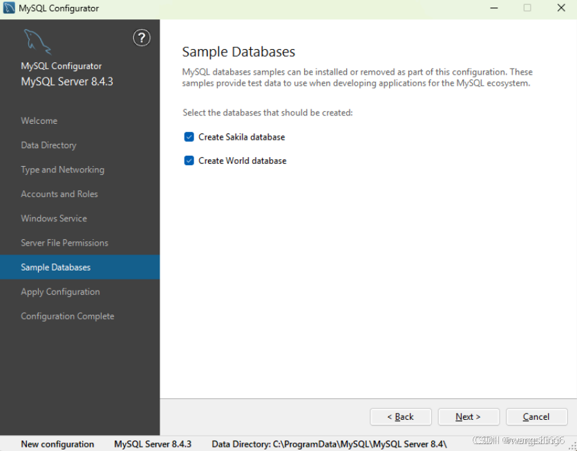 配置示例数据库是否要载入,选中即为载入,我们这里选择载入,单击【 Next 】进行下一步。