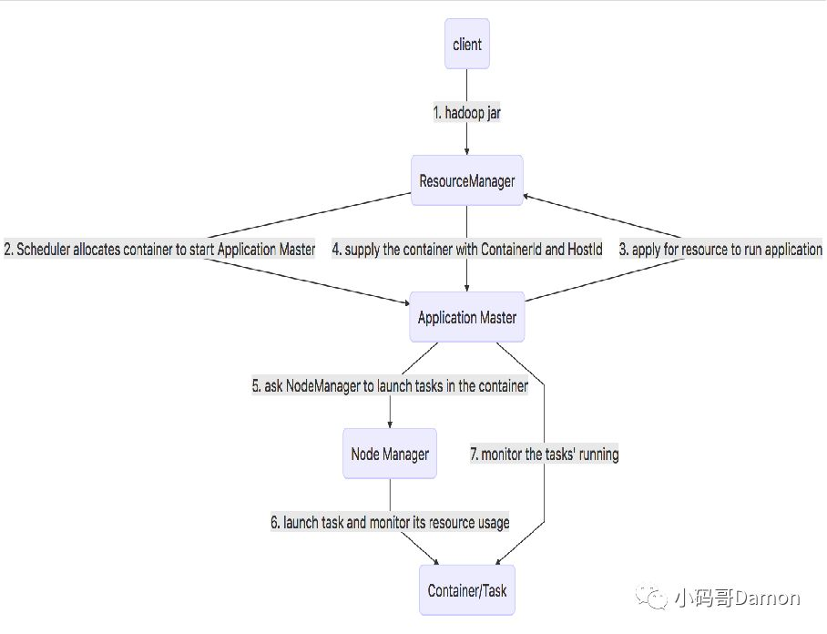 3、ApplicationMaster首先向ResourceManager注册,这样用户可以直接通过ResourceManager查看应用程序的运行状态,然后它将为各个任务申请资源,并监控它的运行状态,直到运行结束,即重复步骤4~7。