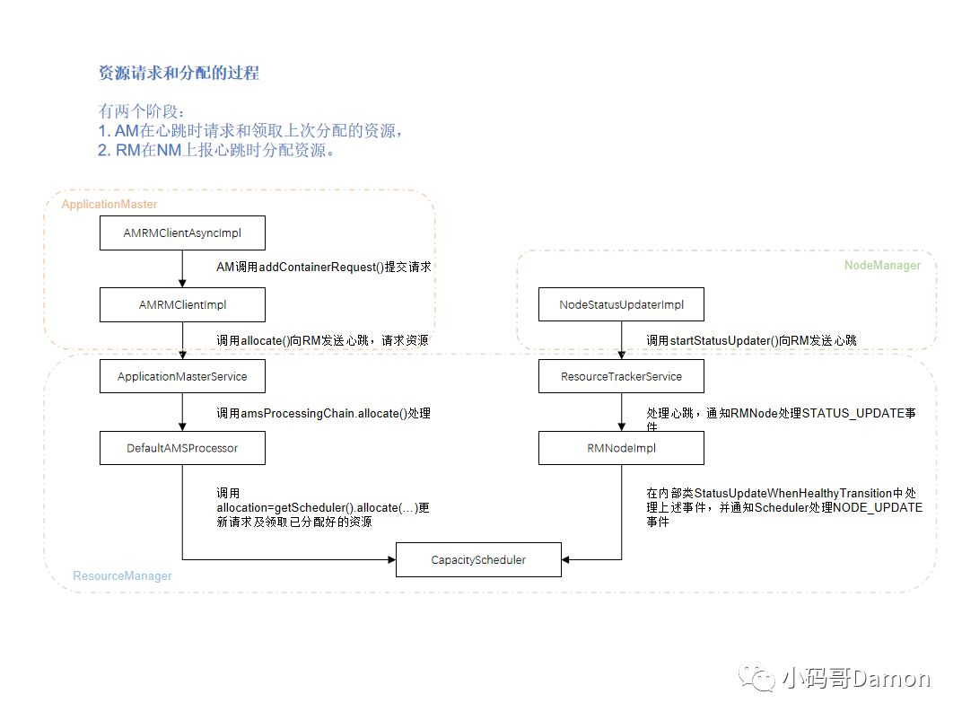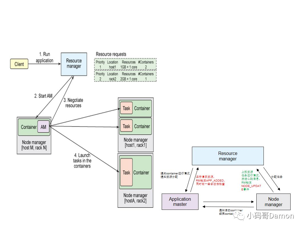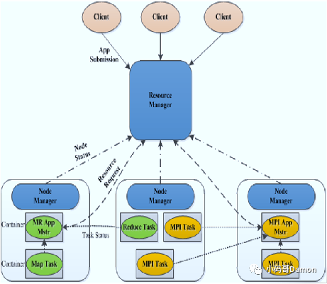 ApplicationMaster(AM):用户提交的每个应用程序均包含一个AM,主要功能与RM调度器协商以获取资源,进一步分配给内部的任务,与NM通信启动/停止任务,监控任务的运行状态 Container:是YARN中资源的抽象,封装了某个节点上的多维度资源,如Memory、CPU、GPU等。当AM向RM申请资源时,RM为AM返回的资源便是用Container表示的。