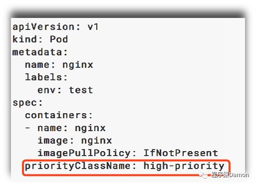 然后通过在Pod的spec. priorityClassName中指定已定义的PriorityClass名称即可: