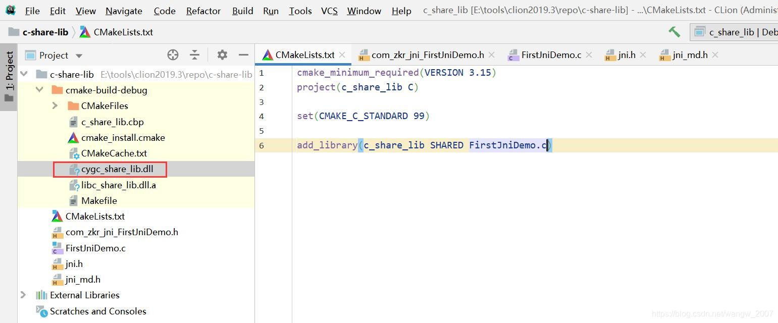 重点来了,dll库咋来的,如上图安装好MingGW配置好Clion后,就只需要把javah生成的java程序的.h头文件以及jdk的jni.h、jni_md.h复制到项目里,当然也可以做其它的处理,比如放到系统库默认搜索路径或在CMakeLists文件中配置,目的只是让头文件的include有效,注意创建项目时区分下静态库和共享库,接下来就是写个c/c++的实现.c/.c++,然后build一下dll就来了,如下图。