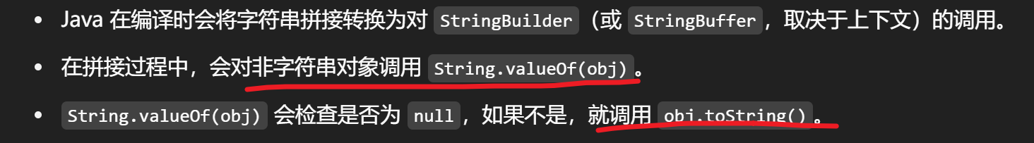 Java 的字符串拼接(使用 +)具有自动调用对象的 toString() 方法的机制: