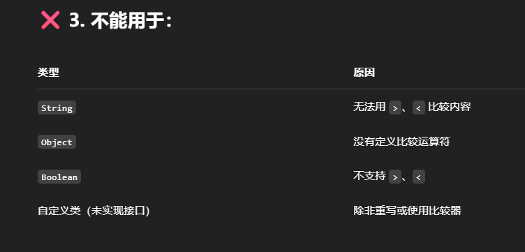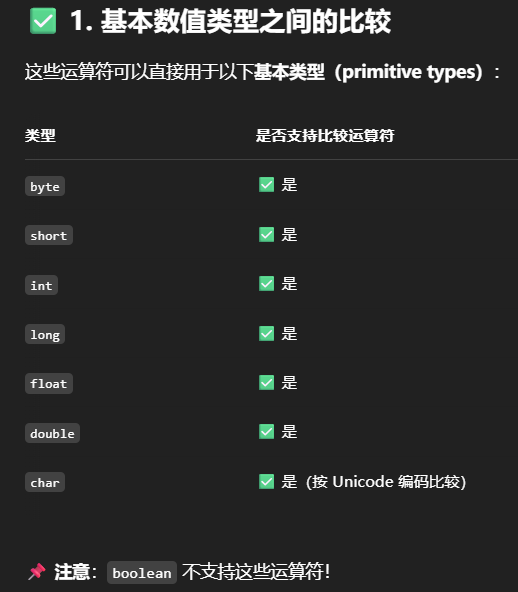 在 Java 中,比较运算符(>, <, >=, <=)只能用于以下几种情况: