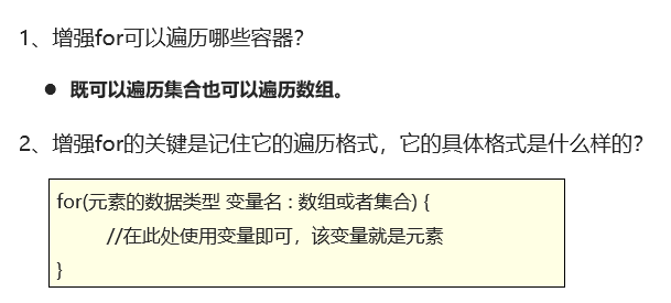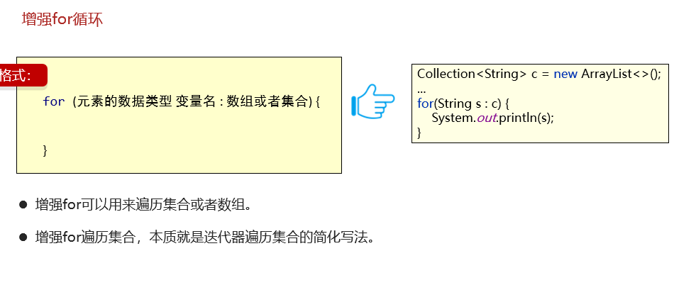 增强for可以用来遍历集合或者数组(Java 的数组之所以可以使用增强 for 循环来遍历,是因为 Java 语言规范中专门为_数组和实现了 Iterable 接口_的对象,内置了增强 for 的支持)。