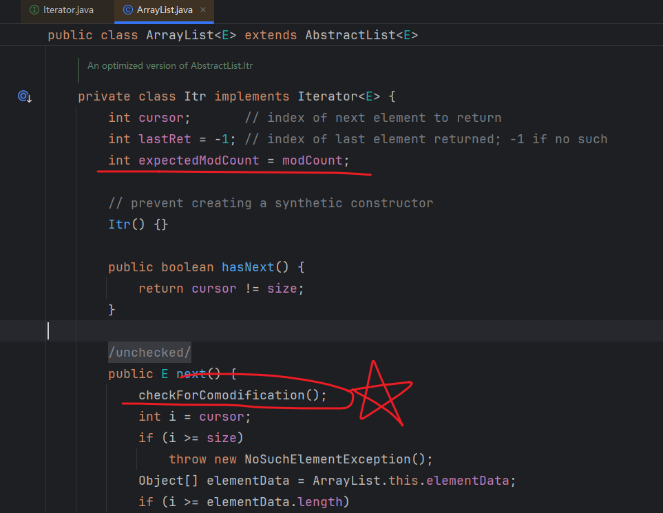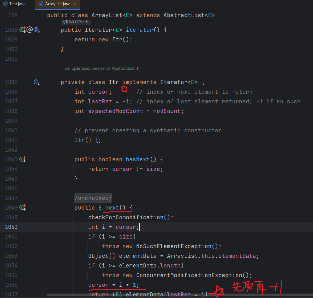ArrayList中的Iterator的实现类:cursor(游标)变量初始化为0,调用next()方法时候,是先取cursor位置的数据,再cursor+1指向下一个数据。