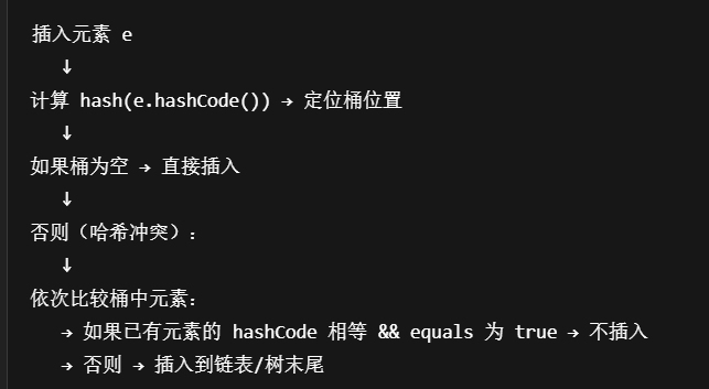 先拿待插入元素的hashcode计算插入的数组的位置,如果位置为空,就直接插入。如果该位置有其他元素,就比较哈希值。如果哈希值不相等,就不是重复元素,直接插入。如果哈希值相等(可能存在哈希碰撞),最后用equals比较是否真的相等:如果相等则不插入,不相等则插入。
