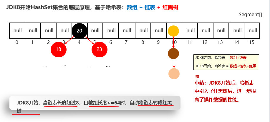 JDK8开始,当链表长度超过8,且数组长度>=64时,自动将链表转成红黑树