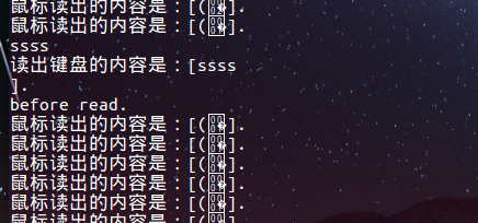 while(1) { //读鼠标 memset(buf, 0, sizeof(buf)); //printf("before 鼠标 read.\n"); ret=read(fd, buf, 50); if(ret>0) //>0,表示已经接收到数据 { printf("鼠标读出的内容是:[%s].\n", buf); } // 读键盘 memset(buf, 0, sizeof(buf)); //printf("before 键盘 read.\n"); ret=read(0, buf, 5); if(ret>0) { printf("键盘读出的内容是:[%s].\n", buf); }