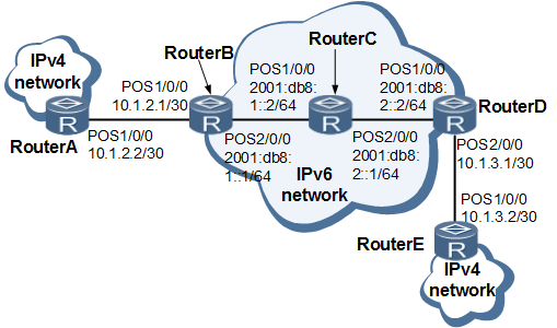 如图1,两个IPv4网络分别通过RouterA和RouterE与IPv6网络连接。IPv6网络的边界设备RouterB和RouterD支持IPv4和IPv6双协议栈。要求在RouterB和RouterD之间配置IPv4 over IPv6隧道,使物理分离的这两个IPv4网络可以互通。