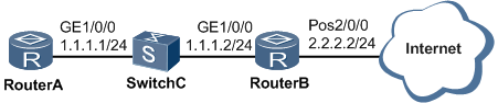 由于网络拓扑比较简单,所以仅仅配置静态缺省路由就可以正常通信。另外,为缺省静态路由绑定BFD会话,利用BFD检测链路故障,可以为静态路由提供保障机制。