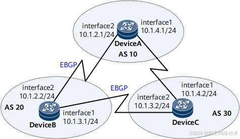 DeviceA、DeviceB和DeviceC各自的Router ID和所在AS号。