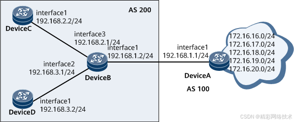 如图1,DeviceB、DeviceC和DeviceD处于AS 200,内部运行OSPF协议,DeviceA处于AS 100。DeviceA从Internet网络接收路由,并为DeviceB提供了部分Internet路由。要求DeviceA仅提供172.16.17.0/24、172.16.18.0/24、172.16.19.0/24给DeviceB,DeviceC仅接收路由172.16.18.0/24,DeviceD接收DeviceB提供的全部路由。