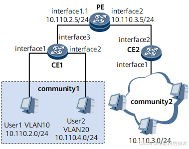 如图1所示,小区1中的不同的用户属于不同的VLAN且位于不同的网段,而小区2中的用户不属于任何VLAN,现需要实现小区1中的VLAN10用户与小区2中的用户互通。