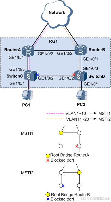 图1所示实例MSTI1的根桥为RouterA,备份根桥为RouterB;实例MSTI2的根桥为RouterB,备份根桥为RouterA