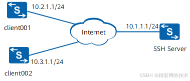 如图1所示,SSH服务器与客户端client001、client002路由可达,此例中用华为设备作为SSH服务器。