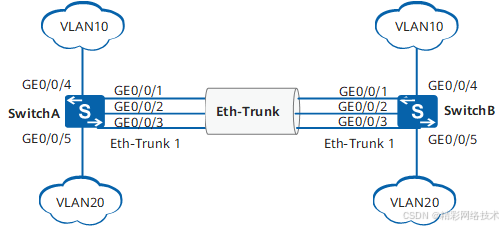 如图1所示,SwitchA和SwitchB通过以太链路分别都连接VLAN10和VLAN20的网络,且SwitchA和SwitchB之间有较大的数据流量。