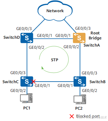 网络规划者规划好网络后,可以在网络中部署STP协议预防环路。当网络中存在环路,STP通过阻塞某个端口以达到破除环路的目的。如图1所示,当前网络中存在环路,SwitchA、SwitchB、SwitchC和SwitchD都运行STP,通过彼此交互信息发现网络中的环路,并有选择的对某个端口进行阻塞,最终将环形网络结构修剪成无环路的树形网络结构,从而防止报文在环形网络中不断循环,避免设备由于重复接收相同的报文造成处理能力下降。