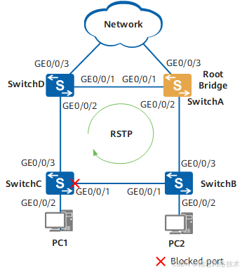 网络规划者规划好网络后,可以在网络中部署RSTP协议预防环路。当网络中存在环路,RSTP通过阻塞某个端口以达到破除环路的目的。如图1所示,当前网络中存在环路,SwitchA、SwitchB、SwitchC和SwitchD都运行RSTP,通过彼此交互信息发现网络中的环路,并有选择的对某个端口进行阻塞,最终将环形网络结构修剪成无环路的树形网络结构,从而防止报文在环形网络中不断循环,避免设备由于重复接收相同的报文造成处理能力下降。