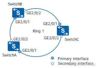 在RRPP域中,配置保护VLAN并创建RRPP环,将SwitchA、SwitchB和SwitchC配置为域1环1的节点。其中配置SwitchA为环1的主节点,SwitchB和SwitchC为环1的传输节点。