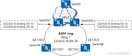 本例仅列举SwitchC和SwitchD上与RRPP环连接的子接口的配置方法,不涉及VPLS网络中各设备之间的相关配置。