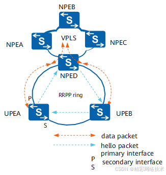 通过在NPED的子接口或VLANIF接口上使能RRPP Snooping,并关联本设备上其余的VSI。当RRPP环网发生故障时,VPLS网络中的NPED可以同步清除本节点VSI(包括关联的VSI)的转发表项和远端VPLS设备NPEB的转发表项,以重新学习表项,使流量切换到非故障的链路,保证下行流量通畅。