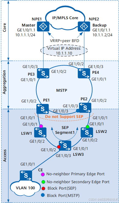 由于PE1和PE2设备不支持SEP协议,故在LSW1和LSW2设备上选择的端口角色必须是无邻居边缘端口。