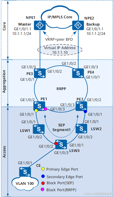 [PE1-GigabitEthernet1/0/1] sep segment 1 edge primary //指定接口加入ID为1的SEP段,且为主边缘接口。