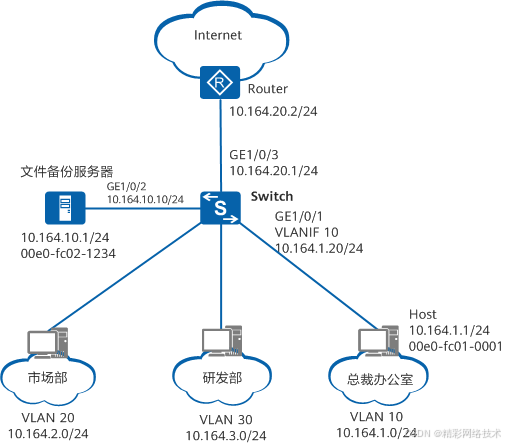 - 在Switch上为文件备份服务器配置静态ARP表项,防止文件备份服务器的ARP表项被ARP攻击报文修改,造成各个部门不能正常访问文件备份服务器。