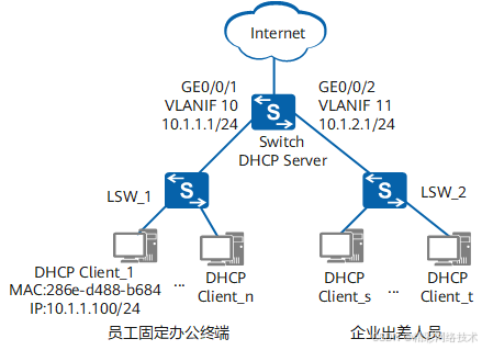 通过在网关设备Switch上配置DHCP服务器,实现为企业两个网段内的终端动态分配IP地址。其中,网段10.1.1.0/24内的PC为员工固定办公终端,IP地址租期配置为30天;网段10.1.2.0/24供企业出差人员临时接入网络,IP地址租期配置为1天。