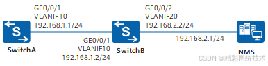 如图1所示,SwitchA通过SwitchB和NMS跨网段相连,SwitchA通过静态路由与NMS进行正常通信。现希望在SwitchA和SwitchB间实时检测链路质量,在链路出现问题时将对应的静态路由从IP路由表删除,使业务流量切换到无链路故障的路由,提高网络的可靠性。