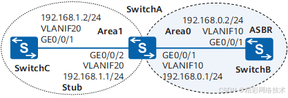 在Area1的ABR(SwitchA)上配置禁止向Stub区域通告Type3 LSA,即将Area1配置为Totally Stub区域,达到最大限度减少SwitchC上OSPF路由表规模的目的。