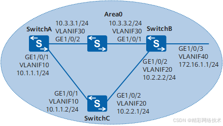 在SwitchA、SwitchB和SwitchC上配置OSPF基本功能,实现整个OSPF网络的互通。