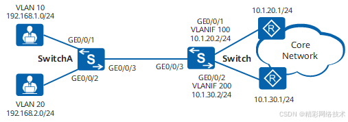 如图1所示,公司用户通过Switch双归属到外部网络设备。其中,一条是高速链路,网关为10.1.20.1/24;另外一条是低速链路,网关为10.1.30.1/24。