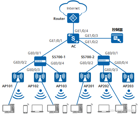 - 配置各网络设备,使AP、接入交换机S5700-1、S5700-2、AC和上层网络设备之间实现网络互通。