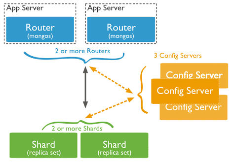 说了这么多传统数据库的架构,那NoSQL怎么去做到了这些呢?MySQL要做到自动扩展需要加一个数据访问层用程序去扩展,数据库的增加、删除、备份还需要程序去控制。一但数据库的节点一多,要维护起来也是非常头疼的。不过MongoDB所有的这一切通过它自己的内部机制就可以搞定的了。如下图看看MongoDB通过哪些机制实现路由、分片: