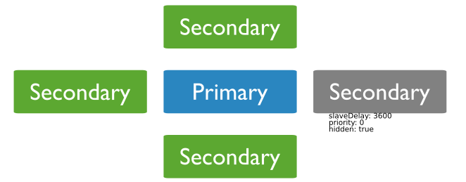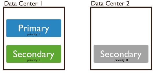 Priority=0 即优先级为0的节点。字面上来说,权限为0。拥有最低的权限。已然是Secondary了,权限还最低,啥影响呢?之前说过,mongoDB的副本集中是有投票机制的,如果一个Primary不可达,那么所有的Secondary会联合起来投票选举,选出心目中的新的Primary。因为只有Primary才能接收Writes的操作,所以Primary在一个mongoDB的集群中是必须的。下图展示了一个在两个IDC中存放Primary,Secondary,以及一个Priority=0的Secondary的场景(关于这个存放方式以及奇数偶数。