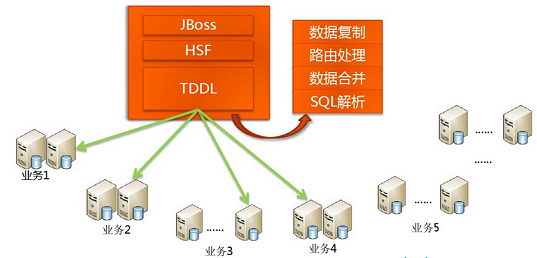 上图中有个TDDL,是TaoBao的一个数据访问层组件,它主要的作用是SQL解析、路由处理。根据应用的请求的功能解析当前访问的sql判断是在哪个业务数据库、哪个表访问查询并返回数据结果。具体如图: