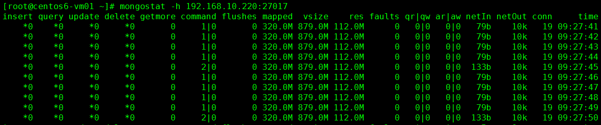 1) mongostat -h, --host 主机名或 主机名:端口 --port 端口号 -u ,--uername 用户名(验证) -p ,--password 密码(验证) --authenticationDatabase 从哪个库进行验证 --discover 发现集群某个其他节点 [root@centos6-vm01 ~]# mongostat -h 192.168.10.220:27017 [root@centos6-vm01 ~]# mongostat -h 192.168.10.220:27017 --discover mongostat重点关注的字段: getmore 大量的排序操作在进行 faults 需要的数据不在内存中 locked db 锁比例最高的库 index miss 索引未命中 qr|qw 读写产生队列,供求失衡