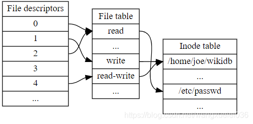 简单的说,就是内核为每个进程维护了一个file descriptor table,file descriptor是file descriptor table的索引,file descriptor table的表项又转而可以索引到系统级的file table,file table又可以索引到系统级的inode table,而这个inode table则真正的描述了底层的文件。系统级的file table还记录了每个文件被打开的方式:读、写、追加…。file descriptor table每个进程都有一个,所以fork的会被拷贝。