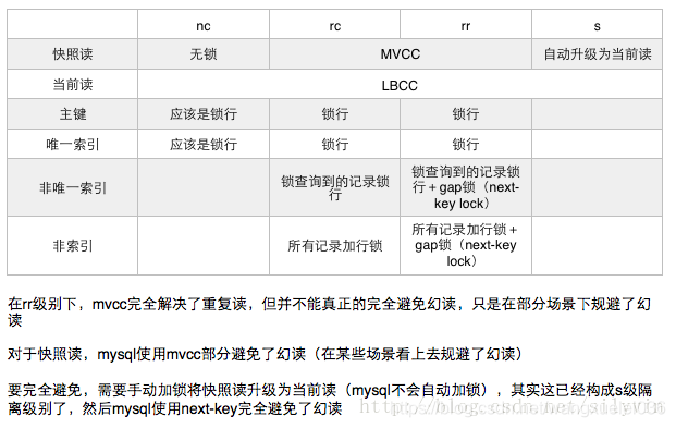 综上所述,默认隔离级别的实现依赖于MVCC和锁,再具体一点是一致性读和锁。