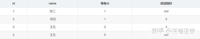 6、假如这时候又来了事务E,对第2条数据进行了更新,这时候会生产一条事务id为5的数据,并把原数据的回滚指针也同时标记为当前的事务id:5,那么会得到如下数据: