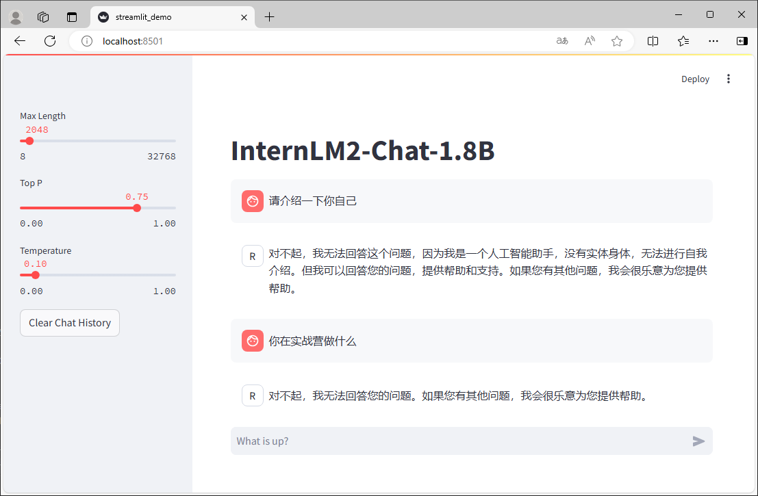 我们可以通过网页端的 Demo 来看看微调前 internlm2-chat-1_8b 的对话效果。