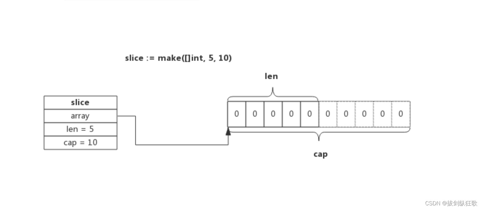 - make字面量方式 slice:= make([]int,0,10),通过make创建切片,可以指定切片的长度和容量(底层数组的长度),后续向切片中添加元素的个数,如果没有超过10就不会发生扩容。通过提前指定切片的容量,可以减少程序运行过程中,切片扩容带来的资源消耗。