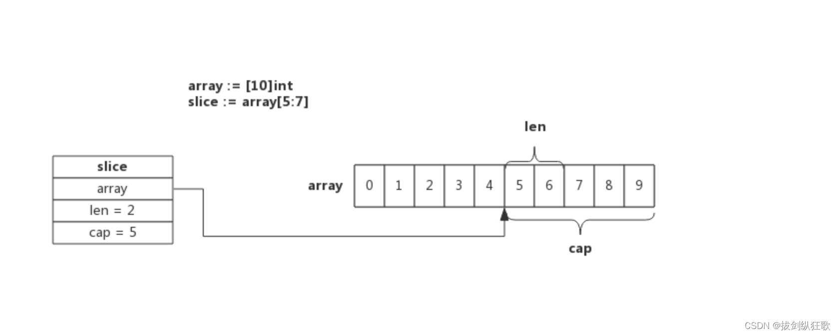 - 使用切片表达式根据切片或数组生成 slice:= array0[low:high]。使用切片表达式创建的切片,其长度为high-low,容量是底层数组的长度-low。