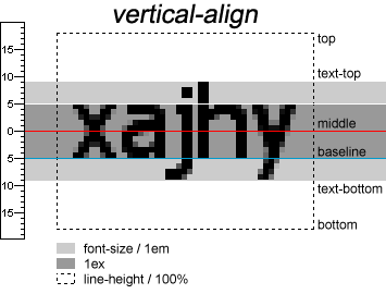 按照W3C的定义,当内联元素的vertical-align设置为: baseline, top, bottom的时候,都是该元素的baseline(或middle, top, bottom)对其周围元素的相同位置,如图片的top和周围文字的top对齐。 text-top和text-bottom的时候,是该元素的top(或bottom)对齐周围元素的text-top(或text-bottom)。 长度(%, em, ex)的时候,是基于baseline往上移动,所以正数往上,负数往下。 middle的时候,是该元素的中心对齐周围元素的中心。这里“中心”的定义是:图片当然就是height的一半的位置,而文字应该是基于baseline往上移动0.5ex,亦即 小写字母“x”的正中心 。但是很多浏览器往往把ex这个单位定义为0.5em,以至于其实不一定是x的正中心(以上图为例,x的高度应该是10px,而em是18px,所以两个值不一样)。