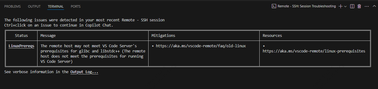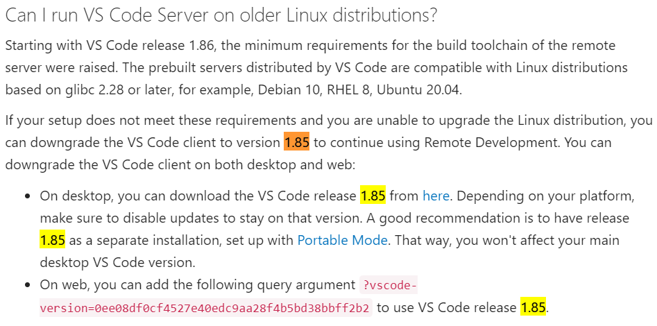 从 VS Code1.86版本开始,提高了对远程服务器构建工具链的最低要求。 VS Code 分发的预构建服务器与基于 glibc 2.28 或更高版本的 Linux 发行版兼容,例如 Debian 10、RHEL 8、Ubuntu 20.04。如果您的设置不满足这些要求并且无法升级 Linux 发行版,您可以将 VS Code 客户端降级到版本