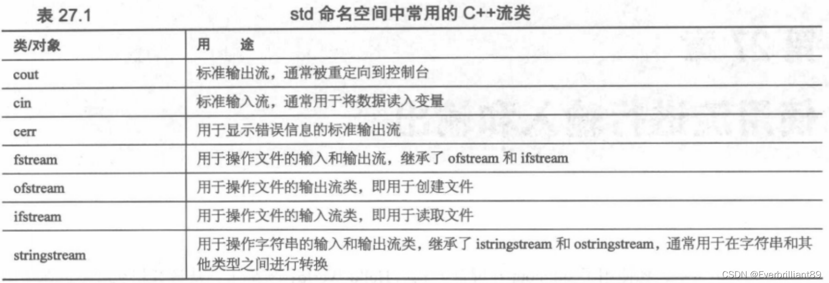 C++流是读写(输入和输出)逻辑的通用实现,能够统一的模式读写数据。不管是磁盘或键盘读取数据,还是将输入写入显示器或磁盘,这些模式都相同。只需使用合适的流类,类的实现将负责处理与设备和操作系统相关的细节。