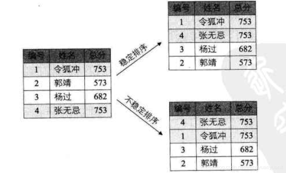 如果ki = kj,且在排序前的序列中ri 领先于rj。如果排序之后,ri仍然领先于rj,则称所用的排序算法是稳定的,否则就是不稳定的。例如:下图中,对总分进行排序,令狐冲和分数和张无忌的分数是一样的,排序之前令狐冲 在 张无忌之前,如果排序之后,令狐冲仍然在张无忌之前,那就是稳定的;否则就是不稳定的。