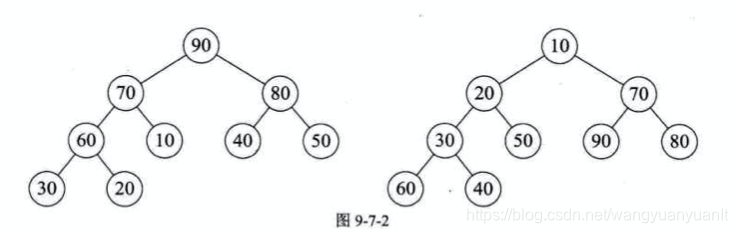 堆是具有下列性质的完全二叉树:每个结点的值都大于或等于其左右孩子结点的值,称为大顶堆;如果每个结点的值都小于或等于其左右孩子结点的值,称为小顶堆。