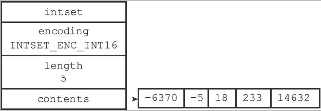- 如果encoding属性的值为INTSET_ENC_INT16,那么contents就是一个int16_t类型的数组,数组里的每个项都是一个int16_t类型的整数值(最小值为-32768,最大值为32767);